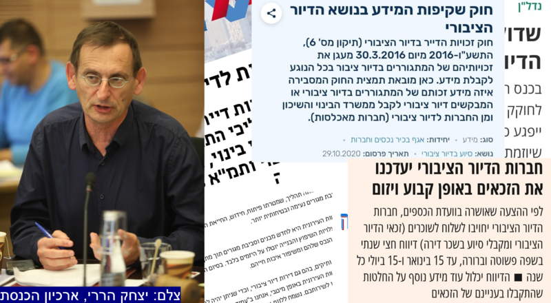 בתחום הדיור הציבורי יזמנו את "חוק השקיפות" – תיקון לחוק זכויות הדייר בדיור הציבורי, המזכה דיירי דיור ציבורי בקבלת מידע.